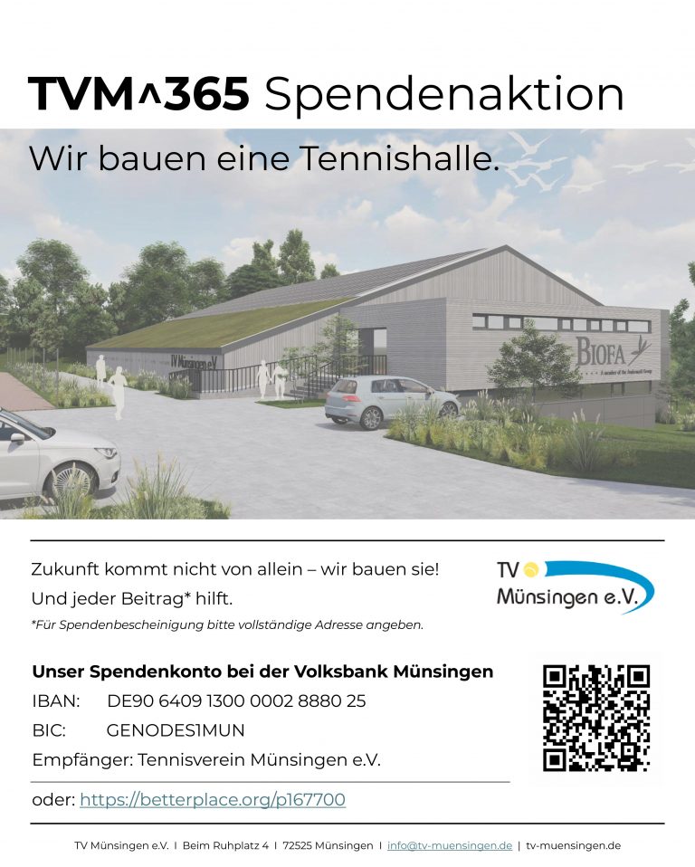 Unsere Freiplätze haben wir witterungsbedingt in der Regel von Ende April bis Ende Oktober geöffnet. Da es in Münsingen keine Tennishalle mehr gibt, müssen wir auf umliegende Tennishallen ausweichen, die zwischen 20 und 35 km entfernt liegen. Als wachsendem Verein ist dies auf Dauer untragbar, weshalb wir eine vereinseigene Tennishalle bauen. Künftig werden wir ganzjährig – an 365 Tagen im Jahr – eine eigene Tennisinfrastruktur an einem Standort anbieten können. Hierfür investieren wir rund 1,75 Mio. EUR (netto.) Dieses Projekt nennen wir TVM^365.